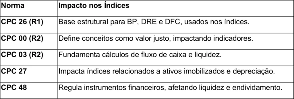 Os cálculos dos índices contábeis não são definidos diretamente por um CPC específico, mas dependem da estruturação das demonstrações financeiras e critérios de mensuração contábil, que seguem principalmente os seguintes CPCs:
