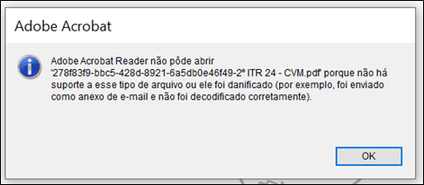 5. Upload do PDF, armazenamento do PDF e armazenamento de dados de identificação: ao fazer o upload de um arquivo em formato PDF na plataforma da ROMEO.AI, ele é imediatamente criptografado antes de ser armazenado no banco de dados. Os dados de identificação das pessoas jurídicas e físicas também são criptografados no banco de dados. Utilizamos criptografia simétrica baseada no algoritmo AES (Advanced Encryption Standard) com uma chave de 256 bits, que é amplamente reconhecido por sua alta segurança e recomendado por organizações como o NIST (National Institute of Standards and Technology). As chaves de criptografia são gerenciadas e protegidas com o Azure Key Vault, garantindo um nível adicional de segurança para os dados armazenados. Abaixo segue um exemplo de mensagem ao tentar abrir um demonstrativo em PDF do ambiente ROMEO fora da aplicação. Segue também um exemplo dos dados de identificação criptografados dentro do banco de dados da Plataforma.