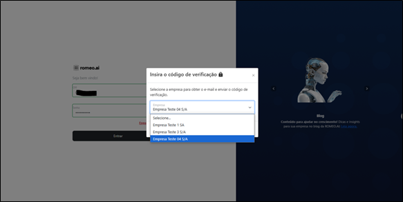 No momento do login, basta inserir o CPF e selecionar a empresa desejada para iniciar a análise.