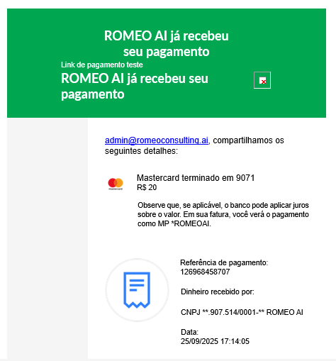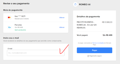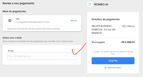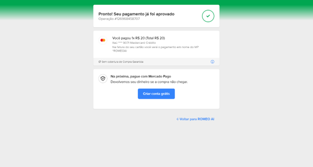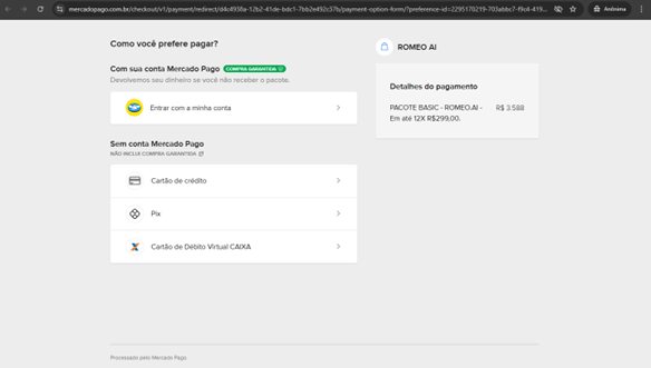 Na rotina de checkout do website da ROMEO.AI, utilizamos a plataforma Mercado Pago, uma solução consolidada e amplamente reconhecida no mercado. Todos os dados solicitados durante o processo de compra são coletados exclusivamente para a contratação e o pagamento das assinaturas, garantindo segurança e conformidade.